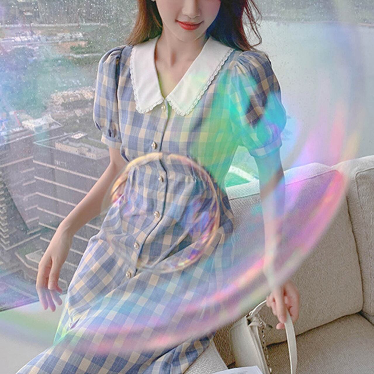 クラシカル ギンガムチェック パフスリーブ 襟ワンピース