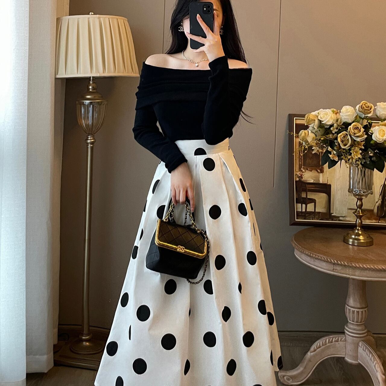 オフショルダー カットソー+ ドット フレアスカート ツーピース