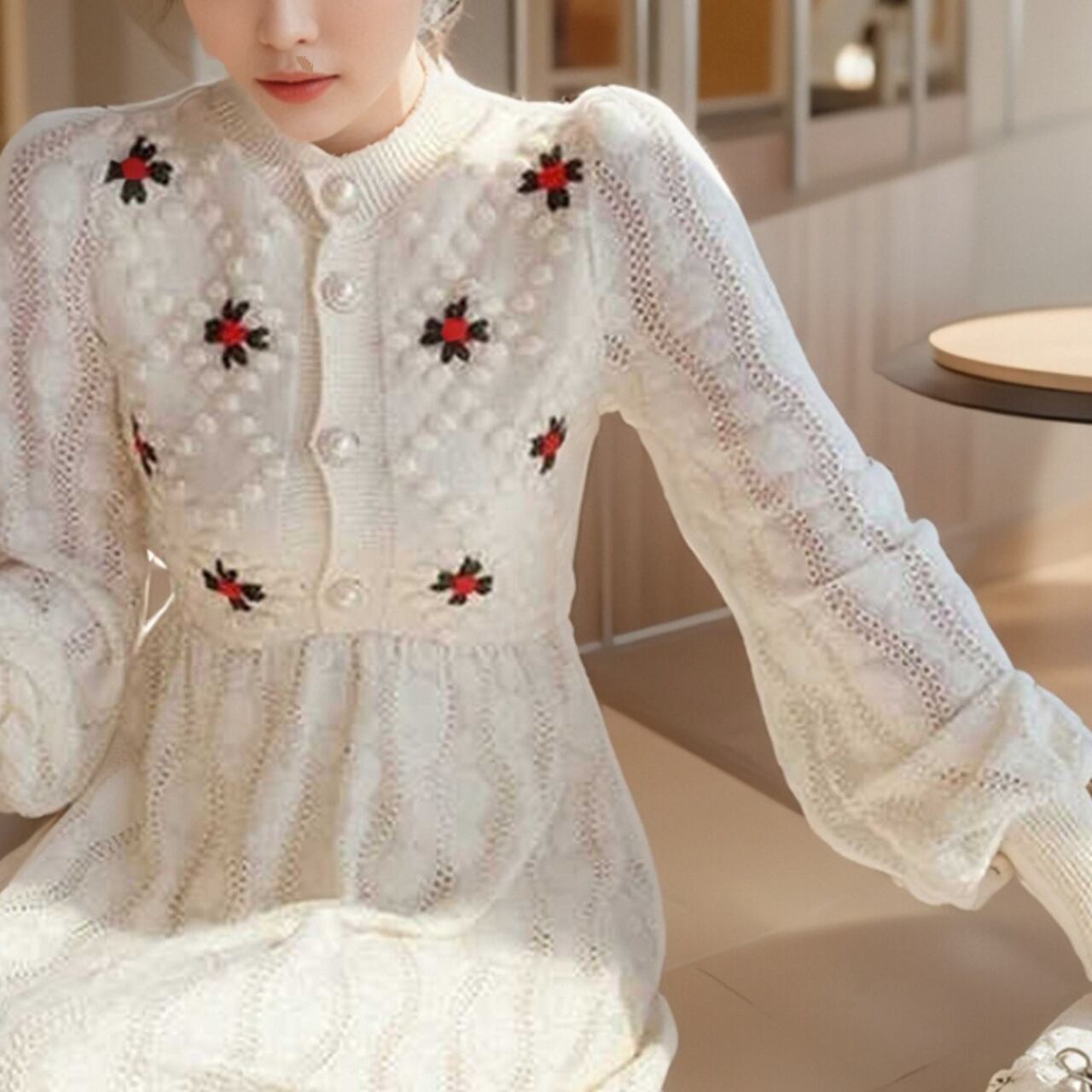 エンブロイダリー ニット ロング ワンピース-ホワイト