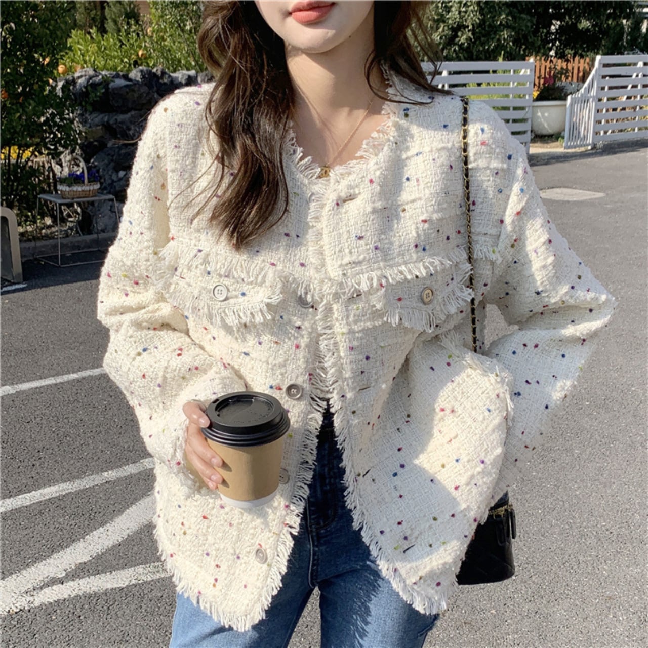 ホワイトのツイード生地にカラフルなドット柄が施され、