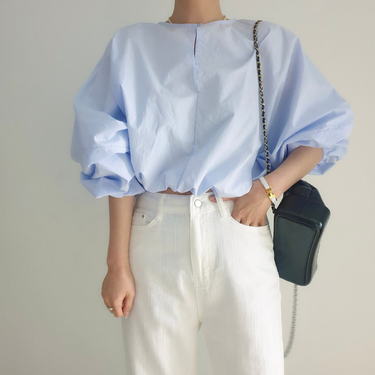 ラウンドネック パフスリーブ トップス-ブルー