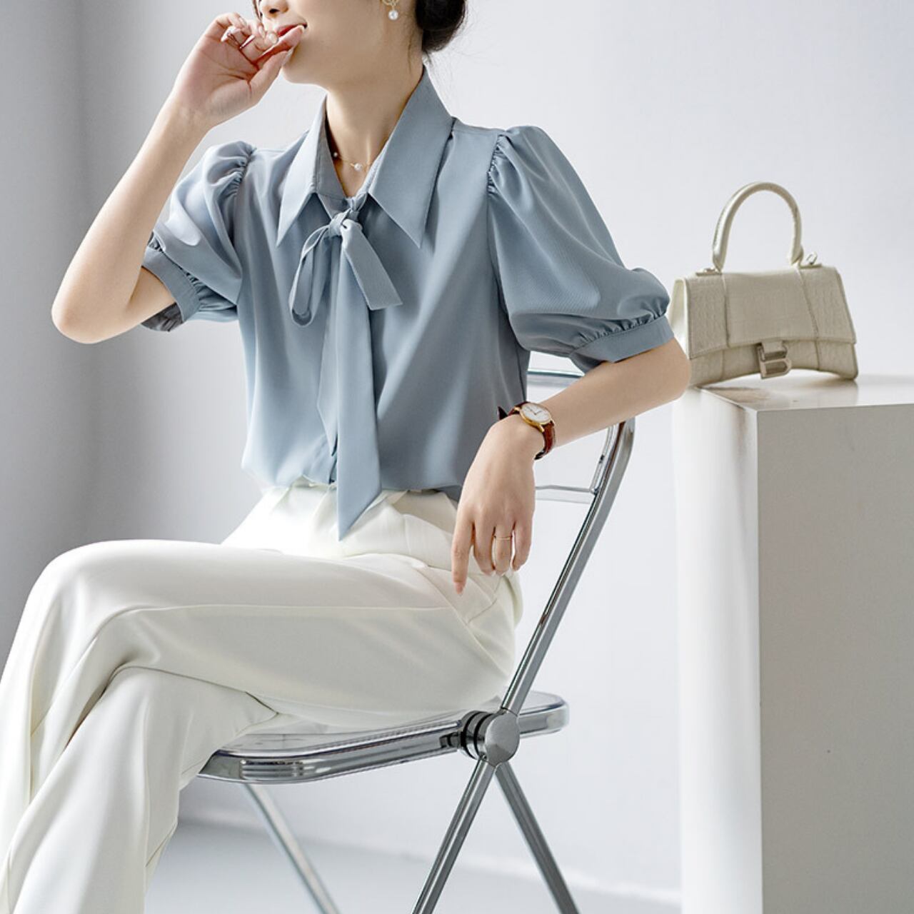 ボウタイ シフォン パフスリーブ シャツ
