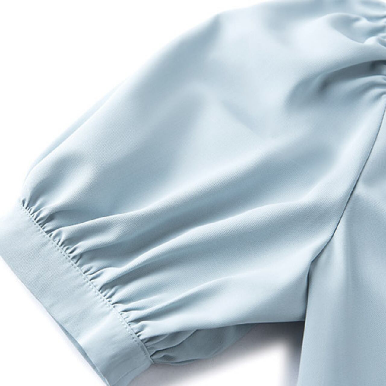 エレガントなボウタイとふんわりとしたパフスリーブが特徴で、