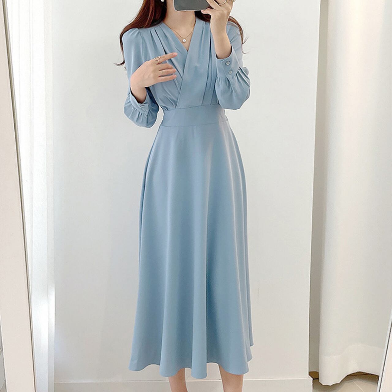 Vネック クロス プリーツ ワンピース-ブルー