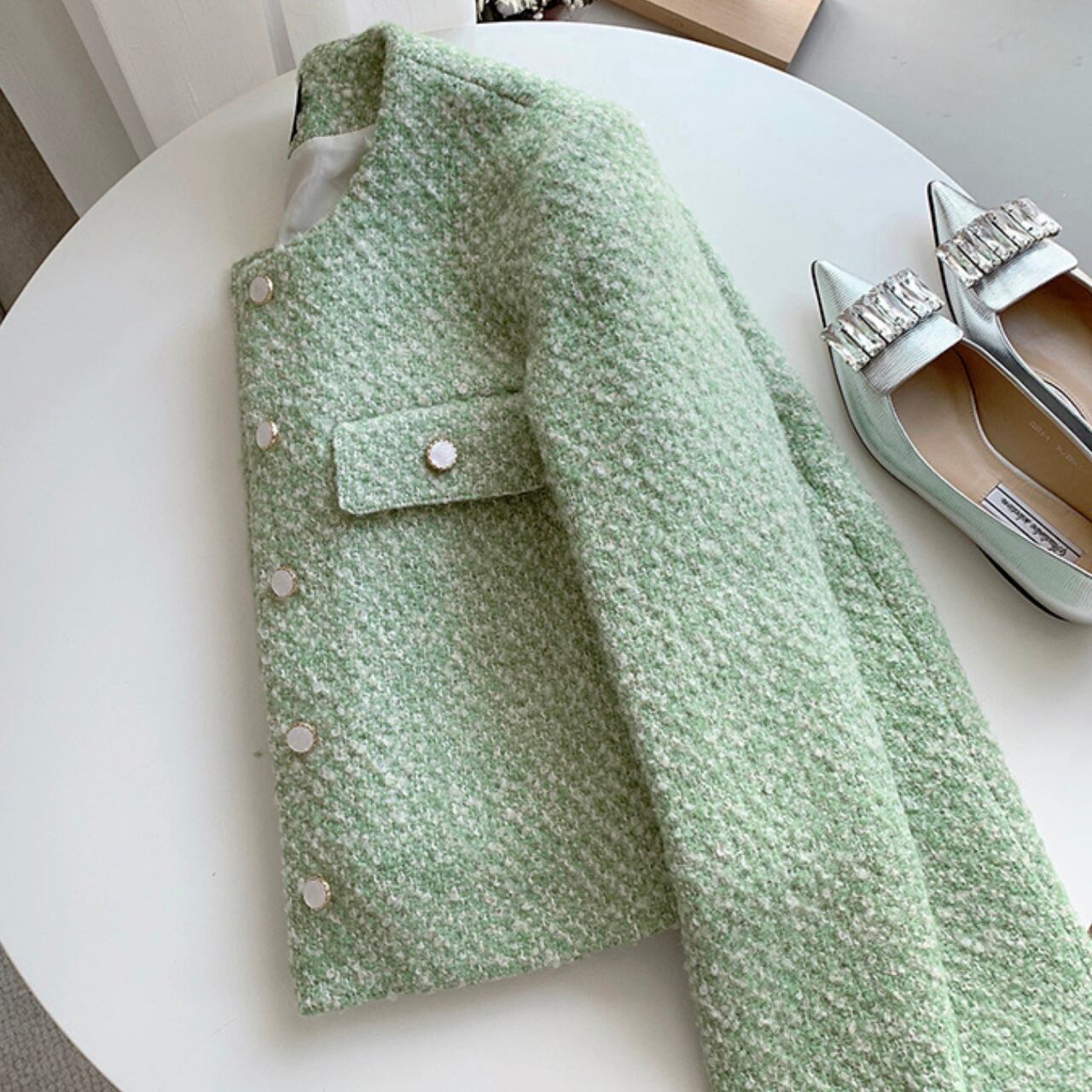 ラウンドネックと春らしいグリーンが特徴のジャケットです。