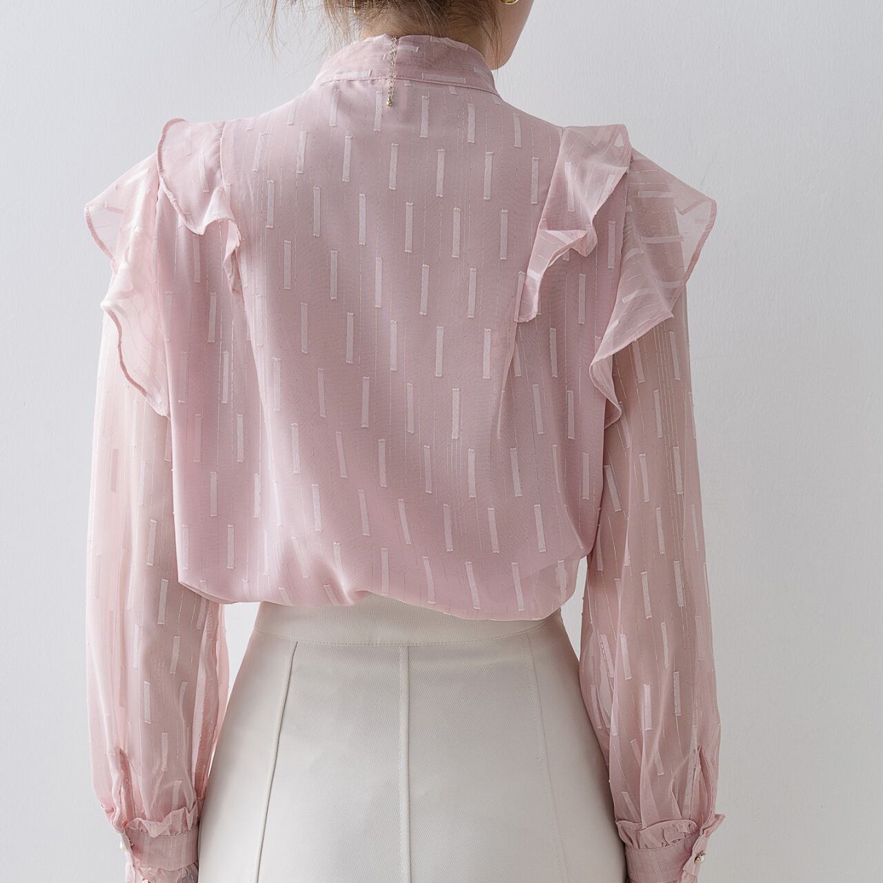 シアーな素材とリボンフリルが魅力的な、このピンクのブラウスは、