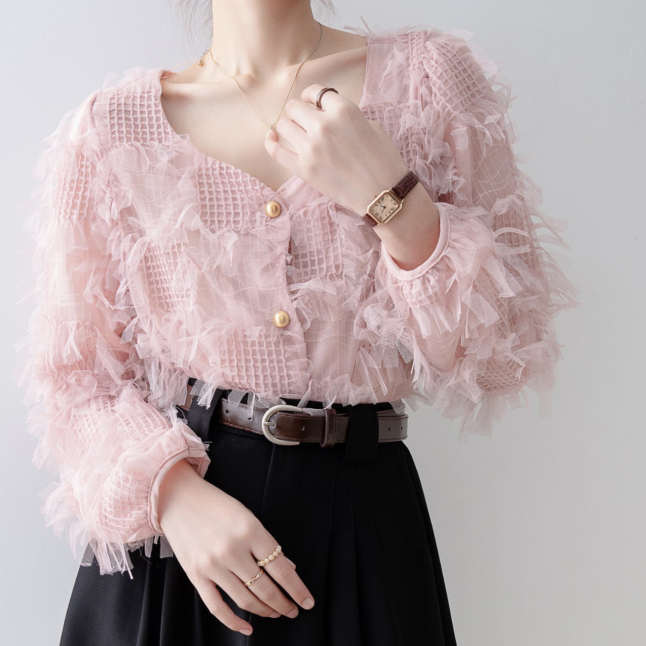 軽やかなチュールが散りばめられた、春の訪れを感じさせるブラウス。