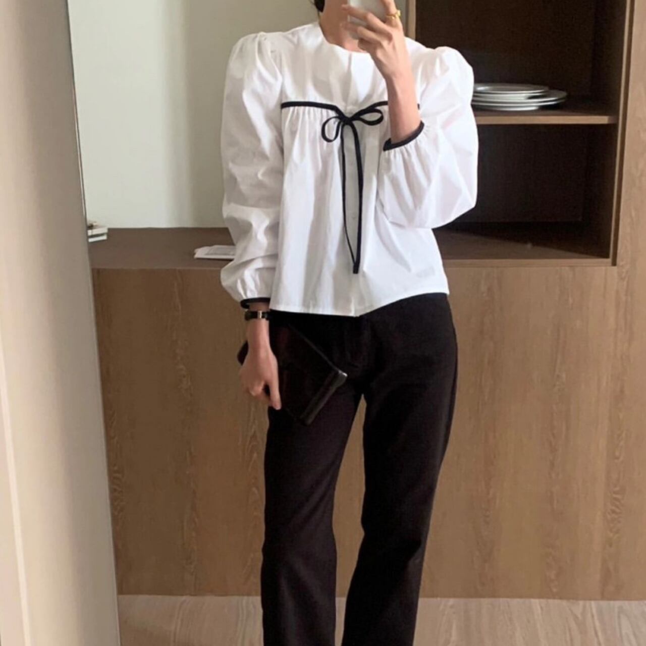 フロント リボン コントラスト ブラウス-ホワイト